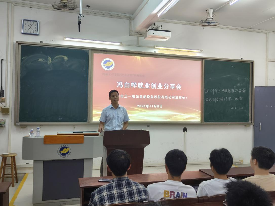 为帮助2025届毕业生提振就业信心,树立正确的就业观念,提高求职技巧,以及洞察行业发展情况。11月8日,德赢vwin体育官网登录邀请优秀校友深圳市三一联光智能设备股份有限公司冯白桦董事长返校进行就业创业分享,分享会由学院党委副书记梁吉霖主持,毕业班辅导员和全体毕业生参加。