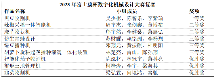 经过综合评审,参赛作品“黑豆收割机”以其独特的设计和高效的功能脱颖而出,荣获一等奖。其次,“辣椒采播一体智能机”和“魔芋收获机”凭借其创新性和实用价值获得了二等奖。此外,“仿生青蛙设计”、“绿豆播种机”以及“胡萝卜旋耕起垄播种灌溉一体化装置”也因其出色的设计理念和实用性获得了三等奖。其他参赛作品同样表现出色,获得了优胜奖。