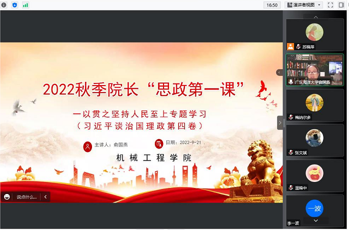 9月21日下午,学院院长俞国燕通过腾讯会议方式为全体研究生140多人作了题为《(习近平谈治国理政)第四卷一以贯之坚持人民至上专题学习》的思政第一课,她通过人民至上是马克思主义政党的显著标志、人民至上是坚持中国共产党党性的根本要求、在中国梦的实践中践行人民至上等方面系统阐述了《习近平谈治国理政》第四卷坚持一卷、二卷、三卷“人民至上”的主线的重大意义。她勉励同学们一是坚定“四个自信”,在淬炼思想初心中践行人民至上;二是笃定“四个意识”,在对党忠诚中践行人民至上;三是站稳人民立场,在担当实干中践行人民至上;四是发挥头雁效应,在为民务实清廉中践行人民至上。